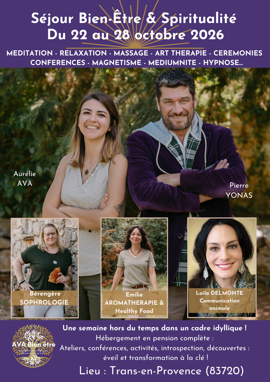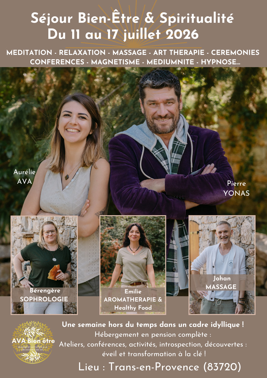 Ava bien être organise des séjours tout inclus : hébergement, repas et activités au service de ton bien être dans un cadre idyllique. Nous réunissons toute notre énergie dans de nombreux ateliers afin que tu passes un séjour extraordinaire, relaxant et dépaysant en notre compagnie ! N’attends plus pour te joindre à cette merveilleuse aventure humaine ! Sourires, bonne ambiance, rencontres, partage, surprises et découvertes seront au rendez-vous !